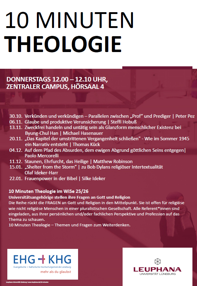 | 20 18:15 -19:45 20.05.2020  Theologisieren für Studierende „Glaube ich das? Auseinandersetzung mit biblischen und theologischen Positionen“ Der Ausgangspunkt zu dieser Übung liegt in studentischer Initiative. Es geht darum, sich mit der individuellen Glaubensbiografie in Verbindung mit Themen der Bibel auseinandersetzen. Theologisieren lässt Raum und Zeit für Diskussionen über eigene Fragen. Danach „für wer will“ weiterer Austausch bei Wasser, Wein und Brot. Anmeldung per Mail an hanusa@leuphana.de
